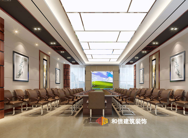 中式多功能會議室色彩搭配以深色為主,色彩濃重而成熟,一張長方形會議桌,大家圍坐著,可以很多人同時與會,總結(jié)會、公司團建、茶話會、交流會都可以在此進行。