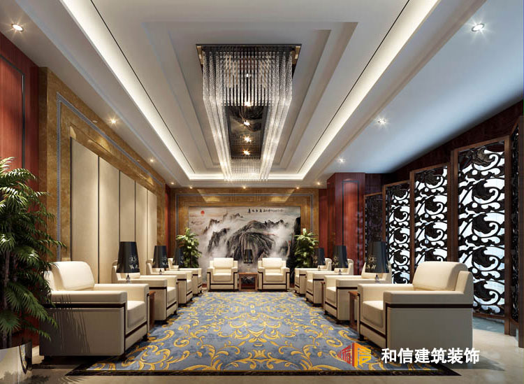前廳空間融合了莊重與優(yōu)雅的雙重氣質(zhì),色彩上以黃色為主色調(diào),將傳統(tǒng)風(fēng)韻與現(xiàn)代的舒適完美地融合在一起,空間以簡單的線條表現(xiàn)出中式的古樸大方,大理石質(zhì)感的前臺,無論是色澤還是造型,都為空間提供美觀性和實用