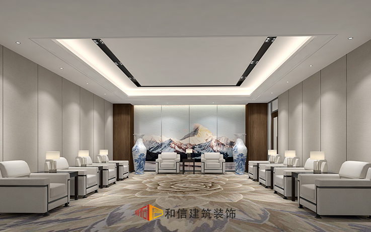墻面設(shè)計(jì)讓整個(gè)空間視覺(jué)上更有立體感和空間的延伸感,會(huì)議桌上不同樣式的燈光使人產(chǎn)生中心和集中感覺(jué),讓整個(gè)會(huì)議室明亮、簡(jiǎn)潔、富有變化,線條秩序呈現(xiàn)出會(huì)議室的高端與嚴(yán)謹(jǐn)