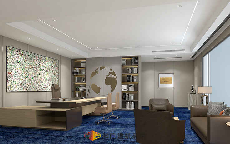 總經(jīng)理辦公室的裝修設(shè)計(jì),直接代表著企業(yè)的形象和實(shí)力,案例中展示的總裁辦公室為新中式風(fēng)格,總裁辦公室既有辦公區(qū)也有接待區(qū),方便了總裁接待客戶,背景墻的裝飾畫(huà)和簡(jiǎn)約鏤空的世界地圖,給人眼前一亮的視覺(jué)沖擊,整排多元收納柜,可以收納不同規(guī)格的商務(wù)文件。