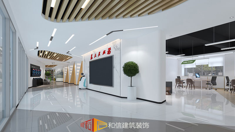 辦事大廳黑白空間碰撞,大面積窗戶將外面的自然景觀引入,給人以清新的感覺,簡潔、醒目,休閑區(qū)巧妙地將空間分為兩個(gè)功能區(qū),流線展示合理引導(dǎo)觀眾路線,讓人感受空間變化的魅力。