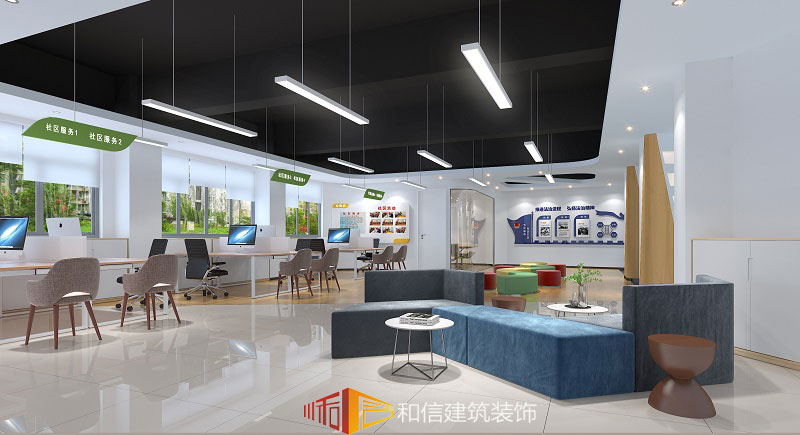 便民服務(wù)中心整個(gè)空間以暖色調(diào)為主,營造一種具有開放性、親民性、視覺性的特色空間格局,原木地板紅、藍(lán)、綠等亮色想碰撞,配以鏤空造型的燈具,營造出明亮的空間氛圍,同時(shí)也豐富了空間的層次感。